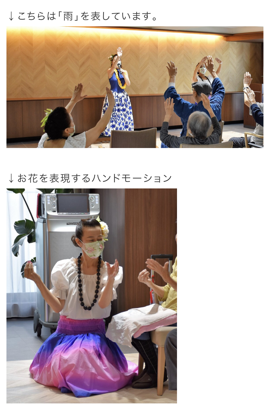 ハワイアン音楽とアロマの香りに癒されながら、椅子に座って安心して行えるフラダンスレクリエーションです。